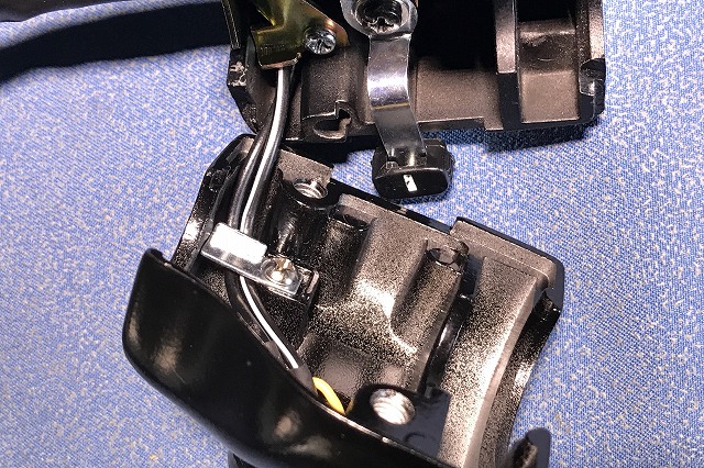 レバーを固定します。 白いスイッチの凹みにレバーの先端が入ります。 次にケーブルストッパーでケーブルを固定します。  |